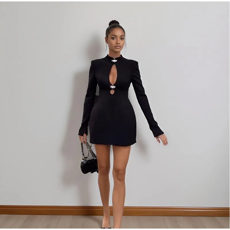 The Ariana is a bold yet refined mini dress designed for women who embrace confidence and elegance. With its sculpted shoulders, high neckline, and statement keyhole cutout, it creates a striking silhouette that’s both powerful and irresistibly feminine. Perfect for soirées, cocktail parties, and nights that call for unforgettable style.